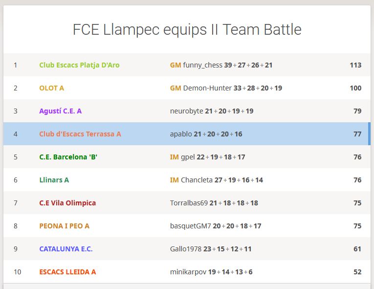 Avui diumenge ha estat la primera jornada, d’un total de tres, del Campionat de Catalunya per equips de partides “Llampec” a un ritmde de 3 minuts + 2 segons.