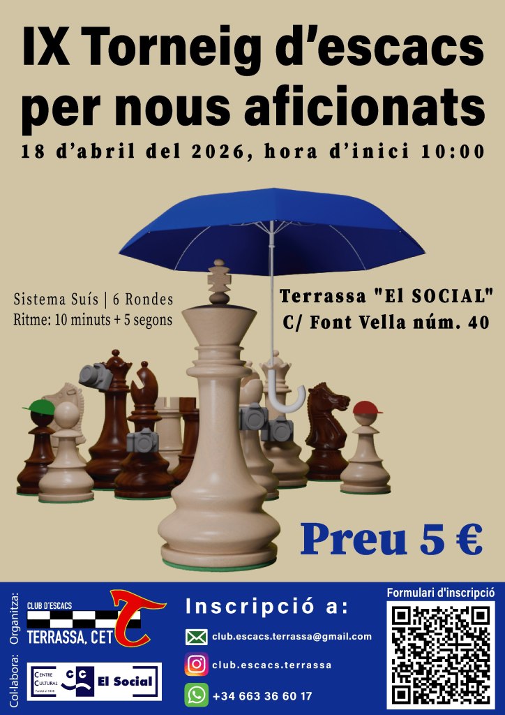 INSCRIPCIÓ: Oberta a totes les edats i nivells. El preu d’inscripció són 5 euros. Pot participar tothom que sàpiga les normes dels escacs, només cal omplir el formulari. El torneig està enfocat per jugadors que fa poc que han començat a jugar i per jugadors no federats. Els jugadors federats experimentats no podrán participar en el torneig. L’organització es reserva el dret d’admissió i podrà excloure qualsevol jugador que no compleixi aquest criteri. Per a qualsevol aclariment, si us plau, poseu-vos en contacte amb l’organització.